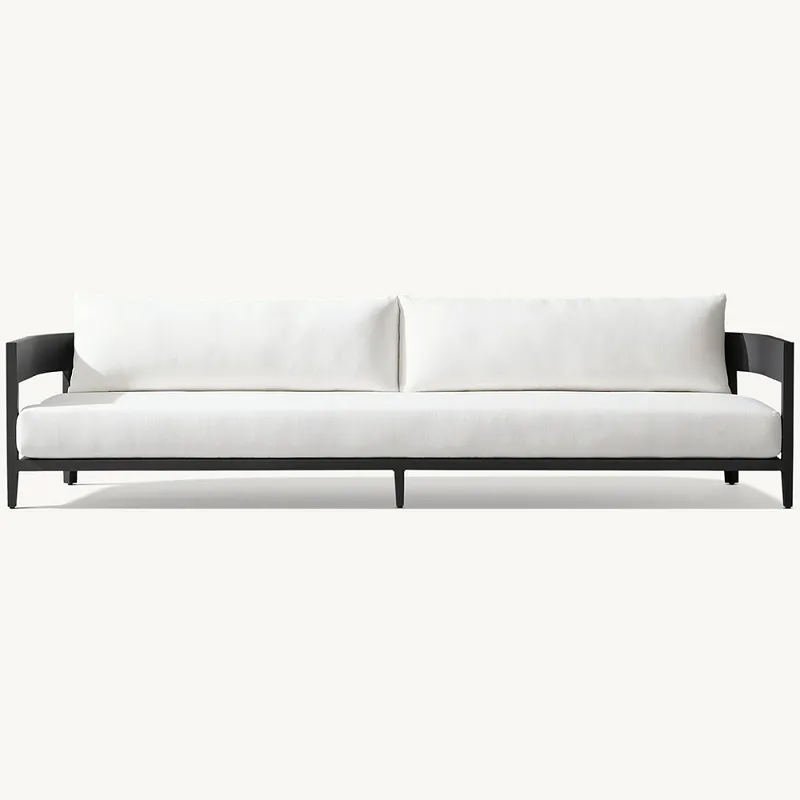 Dieses schwarze Outdoor-Sofa aus Aluminium vereint Haltbarkeit, Komfort und Eleganz, um Ihren Outdoor-Lebensstil zu verbessern. Dieses Sofa aus hochwertigem Aluminium ist hervorragend rost- und korrosionsbeständig und gewährleistet eine lange Lebensdauer auch unter rauen Außenbedingungen. Die weichen Kissen sind aus wetterbeständigem Stoff gefertigt, um luxuriösen Komfort zu bieten und gleichzeitig widerstandsfähig gegen Sonnenlicht und Feuchtigkeit zu bleiben. Unsere Sofas verfügen über ein schlankes, modernes Design, das mühelose Eleganz ausstrahlt und die Schönheit jedes Außenbereichs unterstreicht. Egal, ob Sie eine zwanglose Zusammenkunft veranstalten oder Einsamkeit in der Natur suchen, unsere Sofas bieten die perfekte Mischung aus Stil und Funktion, um all Ihren Bedürfnissen gerecht zu werden. Genießen Sie den Komfort eines minimalen Wartungsaufwands mit unseren schwarzen Aluminiumsofas. Aufgrund der hervorragenden Korrosionsbeständigkeit ist die Reinigung so einfach wie ein schnelles Abwischen mit einem feuchten Tuch. Verbringen Sie weniger Zeit mit der Pflege Ihrer Gartenmöbel und mehr Zeit damit, die Natur zu genießen. Dieses schwarze Outdoor-Sofa aus Aluminium eignet sich nicht nur für die Freizeitgestaltung im Freien mit der Familie, sondern lässt sich auch perfekt in gewerbliche Räumlichkeiten wie Hotelterrassen, Resortgärten usw. integrieren. Seine Vielseitigkeit macht es ideal für alle Arten von Außenbereichen. Wir kontrollieren die Produktqualität stets streng, um sicherzustellen, dass jedes schwarze Outdoor-Sofa aus Aluminium den höchsten Standards entspricht. Sie können mit Vertrauen wählen, unsere Produkte werden Sie nie im Stich lassen.