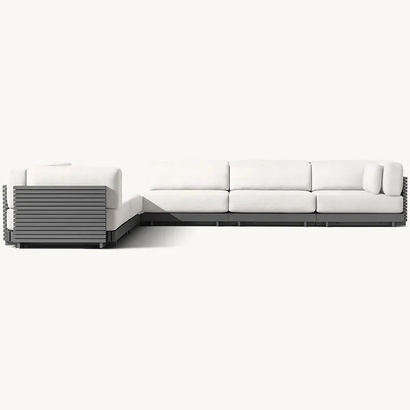 Anpassungsfähigkeit ist bei unserem L-Sofa für die Außenterrasse das A und O. Egal, ob Ihr Außenbereich groß oder klein ist, dieses Sofa lässt sich so konfigurieren, dass es in jede Umgebung passt. Seine L-Form passt natürlich in Ecken, um die Bodenfläche zu maximieren, und lädt Familie und Freunde gleichzeitig ein, sich zurückzulehnen und zu entspannen. Das schlanke, minimalistische Design ergänzt jede Terrassendekoration, von modern minimalistisch bis rustikal, und macht es zu einer vielseitigen Wahl für die Außendekoration.